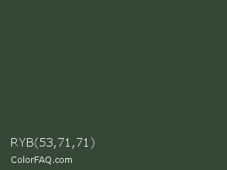 RYB 53,71,71 Color is a dark green color and the nearest color is Kombu Green #354230. Hex code #354735 and RGB value is rgb(53,71,53). In RGB color space, this color is composed of 21% red, 28% green, 21% blue, In CMYK color space, this color is composed of 25% cyan, 0% magenta, 25% yellow , 72% black , In HSL color space, this color has a hue angle of 120° , 15% saturation and 24% lightness.
