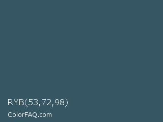 RYB 53,72,98 Color is a dark blue color and the nearest color is Spectra #2f5a57. Hex code #355662 and RGB value is rgb(53,86,98). In RGB color space, this color is composed of 21% red, 34% green, 38% blue, In CMYK color space, this color is composed of 46% cyan, 12% magenta, 0% yellow , 62% black , In HSL color space, this color has a hue angle of 196° , 30% saturation and 30% lightness.