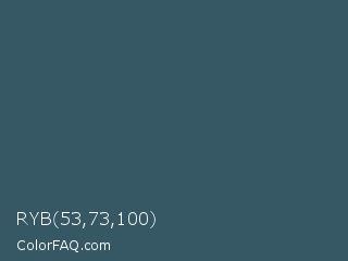 RYB 53,73,100 Color is a dark blue color and the nearest color is Casal #2f6168. Hex code #355864 and RGB value is rgb(53,88,100). In RGB color space, this color is composed of 21% red, 35% green, 39% blue, In CMYK color space, this color is composed of 47% cyan, 12% magenta, 0% yellow , 61% black , In HSL color space, this color has a hue angle of 195° , 31% saturation and 30% lightness.