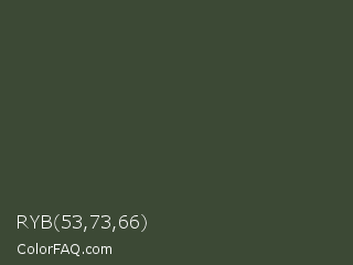 RYB 53,73,66 Color is a dark green color and the nearest color is Lunar Green #3c493a. Hex code #3c4935 and RGB value is rgb(60,73,53). In RGB color space, this color is composed of 24% red, 29% green, 21% blue, In CMYK color space, this color is composed of 18% cyan, 0% magenta, 27% yellow , 71% black , In HSL color space, this color has a hue angle of 99° , 16% saturation and 25% lightness.