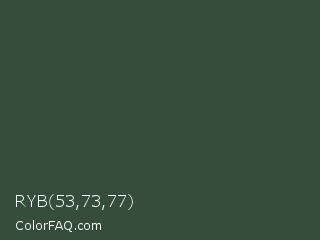 RYB 53,73,77 Color is a dark green color and the nearest color is Lunar Green #3c493a. Hex code #354d3a and RGB value is rgb(53,77,58). In RGB color space, this color is composed of 21% red, 30% green, 23% blue, In CMYK color space, this color is composed of 31% cyan, 0% magenta, 25% yellow , 70% black , In HSL color space, this color has a hue angle of 133° , 18% saturation and 25% lightness.