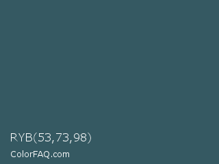 RYB 53,73,98 Color is a dark cyan color and the nearest color is Casal #2f6168. Hex code #355962 and RGB value is rgb(53,89,98). In RGB color space, this color is composed of 21% red, 35% green, 38% blue, In CMYK color space, this color is composed of 46% cyan, 9% magenta, 0% yellow , 62% black , In HSL color space, this color has a hue angle of 192° , 30% saturation and 30% lightness.