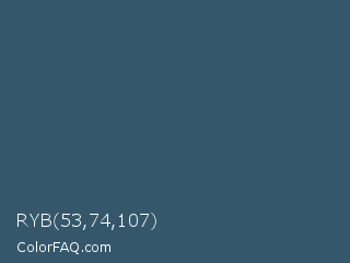RYB 53,74,107 Color is a normal blue color and the nearest color is Casal #2f6168. Hex code #35576b and RGB value is rgb(53,87,107). In RGB color space, this color is composed of 21% red, 34% green, 42% blue, In CMYK color space, this color is composed of 50% cyan, 19% magenta, 0% yellow , 58% black , In HSL color space, this color has a hue angle of 202° , 34% saturation and 31% lightness.