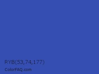 RYB 53,74,177 Color is a normal blue color and the nearest color is Violet Blue #324ab2. Hex code #354eb1 and RGB value is rgb(53,78,177). In RGB color space, this color is composed of 21% red, 31% green, 69% blue, In CMYK color space, this color is composed of 70% cyan, 56% magenta, 0% yellow , 31% black , In HSL color space, this color has a hue angle of 228° , 54% saturation and 45% lightness.