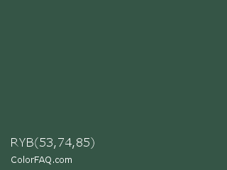 RYB 53,74,85 Color is a dark green color and the nearest color is Dark Slate Gray #2f4f4f. Hex code #355546 and RGB value is rgb(53,85,70). In RGB color space, this color is composed of 21% red, 33% green, 27% blue, In CMYK color space, this color is composed of 38% cyan, 0% magenta, 18% yellow , 67% black , In HSL color space, this color has a hue angle of 152° , 23% saturation and 27% lightness.