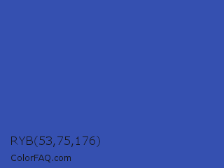 RYB 53,75,176 Color is a normal blue color and the nearest color is Violet Blue #324ab2. Hex code #3550b0 and RGB value is rgb(53,80,176). In RGB color space, this color is composed of 21% red, 31% green, 69% blue, In CMYK color space, this color is composed of 70% cyan, 55% magenta, 0% yellow , 31% black , In HSL color space, this color has a hue angle of 227° , 54% saturation and 45% lightness.