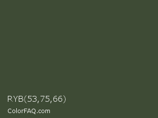 RYB 53,75,66 Color is a dark green color and the nearest color is Cabbage Pont #3f4c3a. Hex code #3e4b35 and RGB value is rgb(62,75,53). In RGB color space, this color is composed of 24% red, 29% green, 21% blue, In CMYK color space, this color is composed of 17% cyan, 0% magenta, 29% yellow , 71% black , In HSL color space, this color has a hue angle of 95° , 17% saturation and 25% lightness.