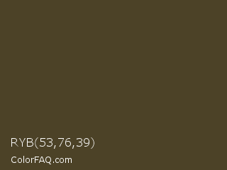 RYB 53,76,39 Color is a dark orange color and the nearest color is Mondo #4a3c30. Hex code #4c4227 and RGB value is rgb(76,66,39). In RGB color space, this color is composed of 30% red, 26% green, 15% blue, In CMYK color space, this color is composed of 0% cyan, 13% magenta, 49% yellow , 70% black , In HSL color space, this color has a hue angle of 44° , 32% saturation and 23% lightness.