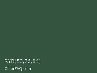 RYB 53,76,84 Color is a dark green color and the nearest color is Hunter Green #355e3b. Hex code #355440 and RGB value is rgb(53,84,64). In RGB color space, this color is composed of 21% red, 33% green, 25% blue, In CMYK color space, this color is composed of 37% cyan, 0% magenta, 24% yellow , 67% black , In HSL color space, this color has a hue angle of 141° , 23% saturation and 27% lightness.