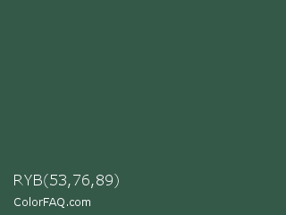 RYB 53,76,89 Color is a dark green color and the nearest color is Stromboli #325d52. Hex code #355949 and RGB value is rgb(53,89,73). In RGB color space, this color is composed of 21% red, 35% green, 29% blue, In CMYK color space, this color is composed of 40% cyan, 0% magenta, 18% yellow , 65% black , In HSL color space, this color has a hue angle of 153° , 25% saturation and 28% lightness.