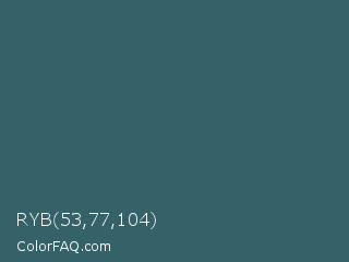 RYB 53,77,104 Color is a normal cyan color and the nearest color is Casal #2f6168. Hex code #356268 and RGB value is rgb(53,98,104). In RGB color space, this color is composed of 21% red, 38% green, 41% blue, In CMYK color space, this color is composed of 49% cyan, 6% magenta, 0% yellow , 59% black , In HSL color space, this color has a hue angle of 187° , 32% saturation and 31% lightness.