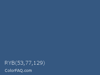 RYB 53,77,129 Color is a normal blue color and the nearest color is Chambray #354e8c. Hex code #355881 and RGB value is rgb(53,88,129). In RGB color space, this color is composed of 21% red, 35% green, 51% blue, In CMYK color space, this color is composed of 59% cyan, 32% magenta, 0% yellow , 49% black , In HSL color space, this color has a hue angle of 212° , 42% saturation and 36% lightness.
