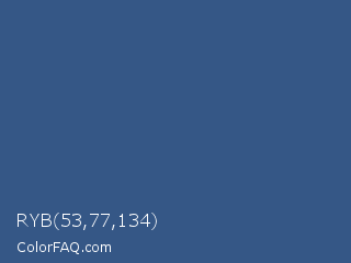 RYB 53,77,134 Color is a normal blue color and the nearest color is Chambray #354e8c. Hex code #355786 and RGB value is rgb(53,87,134). In RGB color space, this color is composed of 21% red, 34% green, 53% blue, In CMYK color space, this color is composed of 60% cyan, 35% magenta, 0% yellow , 47% black , In HSL color space, this color has a hue angle of 215° , 43% saturation and 37% lightness.