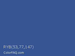 RYB 53,77,147 Color is a normal blue color and the nearest color is B Dazzled Blue #2e5894. Hex code #355593 and RGB value is rgb(53,85,147). In RGB color space, this color is composed of 21% red, 33% green, 58% blue, In CMYK color space, this color is composed of 64% cyan, 42% magenta, 0% yellow , 42% black , In HSL color space, this color has a hue angle of 220° , 47% saturation and 39% lightness.