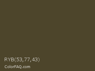 RYB 53,77,43 Color is a dark yellow color and the nearest color is Mondo #4a3c30. Hex code #4d452b and RGB value is rgb(77,69,43). In RGB color space, this color is composed of 30% red, 27% green, 17% blue, In CMYK color space, this color is composed of 0% cyan, 10% magenta, 44% yellow , 70% black , In HSL color space, this color has a hue angle of 46° , 28% saturation and 24% lightness.