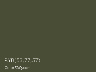 RYB 53,77,57 Color is a dark yellow color and the nearest color is Kelp #454936. Hex code #494d35 and RGB value is rgb(73,77,53). In RGB color space, this color is composed of 29% red, 30% green, 21% blue, In CMYK color space, this color is composed of 5% cyan, 0% magenta, 31% yellow , 70% black , In HSL color space, this color has a hue angle of 70° , 18% saturation and 25% lightness.