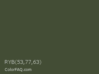 RYB 53,77,63 Color is a dark green color and the nearest color is Rifle Green #444c38. Hex code #434d35 and RGB value is rgb(67,77,53). In RGB color space, this color is composed of 26% red, 30% green, 21% blue, In CMYK color space, this color is composed of 13% cyan, 0% magenta, 31% yellow , 70% black , In HSL color space, this color has a hue angle of 85° , 18% saturation and 25% lightness.