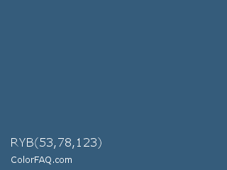 RYB 53,78,123 Color is a normal blue color and the nearest color is William #3a686c. Hex code #355c7b and RGB value is rgb(53,92,123). In RGB color space, this color is composed of 21% red, 36% green, 48% blue, In CMYK color space, this color is composed of 57% cyan, 25% magenta, 0% yellow , 52% black , In HSL color space, this color has a hue angle of 207° , 40% saturation and 35% lightness.