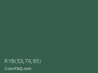 RYB 53,79,95 Color is a dark green color and the nearest color is Stromboli #325d52. Hex code #355f4f and RGB value is rgb(53,95,79). In RGB color space, this color is composed of 21% red, 37% green, 31% blue, In CMYK color space, this color is composed of 44% cyan, 0% magenta, 17% yellow , 63% black , In HSL color space, this color has a hue angle of 157° , 28% saturation and 29% lightness.