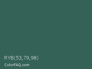 RYB 53,79,98 Color is a dark cyan color and the nearest color is Stromboli #325d52. Hex code #356256 and RGB value is rgb(53,98,86). In RGB color space, this color is composed of 21% red, 38% green, 34% blue, In CMYK color space, this color is composed of 46% cyan, 0% magenta, 12% yellow , 62% black , In HSL color space, this color has a hue angle of 164° , 30% saturation and 30% lightness.