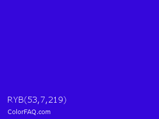 RYB 53,7,219 Color is a normal indigo color and the nearest color is Interdimensional Blue #360ccc. Hex code #3507db and RGB value is rgb(53,7,219). In RGB color space, this color is composed of 21% red, 3% green, 86% blue, In CMYK color space, this color is composed of 76% cyan, 97% magenta, 0% yellow , 14% black , In HSL color space, this color has a hue angle of 253° , 94% saturation and 44% lightness.