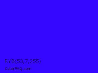 RYB 53,7,255 Color is a normal indigo color and the nearest color is Electric Ultramarine #3f00ff. Hex code #3507ff and RGB value is rgb(53,7,255). In RGB color space, this color is composed of 21% red, 3% green, 100% blue, In CMYK color space, this color is composed of 79% cyan, 97% magenta, 0% yellow , 0% black , In HSL color space, this color has a hue angle of 251° , 100% saturation and 51% lightness.