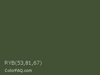 RYB 53,81,67 Color is a dark green color and the nearest color is Rifle Green #444c38. Hex code #435135 and RGB value is rgb(67,81,53). In RGB color space, this color is composed of 26% red, 32% green, 21% blue, In CMYK color space, this color is composed of 17% cyan, 0% magenta, 35% yellow , 68% black , In HSL color space, this color has a hue angle of 90° , 21% saturation and 26% lightness.