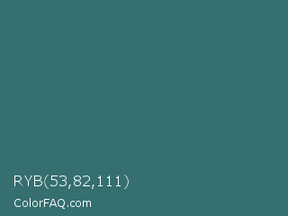 RYB 53,82,111 Color is a normal cyan color and the nearest color is Oracle #377475. Hex code #356f6f and RGB value is rgb(53,111,111). In RGB color space, this color is composed of 21% red, 44% green, 44% blue, In CMYK color space, this color is composed of 52% cyan, 0% magenta, 0% yellow , 56% black , In HSL color space, this color has a hue angle of 180° , 35% saturation and 32% lightness.