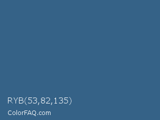 RYB 53,82,135 Color is a normal blue color and the nearest color is Calypso #31728d. Hex code #356287 and RGB value is rgb(53,98,135). In RGB color space, this color is composed of 21% red, 38% green, 53% blue, In CMYK color space, this color is composed of 61% cyan, 27% magenta, 0% yellow , 47% black , In HSL color space, this color has a hue angle of 207° , 44% saturation and 37% lightness.