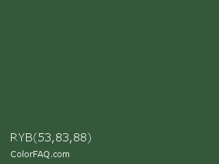 RYB 53,83,88 Color is a dark green color and the nearest color is Hunter Green #355e3b. Hex code #35583b and RGB value is rgb(53,88,59). In RGB color space, this color is composed of 21% red, 35% green, 23% blue, In CMYK color space, this color is composed of 40% cyan, 0% magenta, 33% yellow , 65% black , In HSL color space, this color has a hue angle of 130° , 25% saturation and 28% lightness.