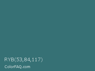RYB 53,84,117 Color is a normal cyan color and the nearest color is Oracle #377475. Hex code #357175 and RGB value is rgb(53,113,117). In RGB color space, this color is composed of 21% red, 44% green, 46% blue, In CMYK color space, this color is composed of 55% cyan, 3% magenta, 0% yellow , 54% black , In HSL color space, this color has a hue angle of 184° , 38% saturation and 33% lightness.
