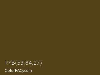 RYB 53,84,27 Color is a very dark orange color and the nearest color is Punga #4d3d14. Hex code #54421b and RGB value is rgb(84,66,27). In RGB color space, this color is composed of 33% red, 26% green, 11% blue, In CMYK color space, this color is composed of 0% cyan, 21% magenta, 68% yellow , 67% black , In HSL color space, this color has a hue angle of 41° , 51% saturation and 22% lightness.