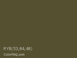 RYB 53,84,48 Color is a dark yellow color and the nearest color is Woodland #4d5328. Hex code #545030 and RGB value is rgb(84,80,48). In RGB color space, this color is composed of 33% red, 31% green, 19% blue, In CMYK color space, this color is composed of 0% cyan, 5% magenta, 43% yellow , 67% black , In HSL color space, this color has a hue angle of 53° , 27% saturation and 26% lightness.