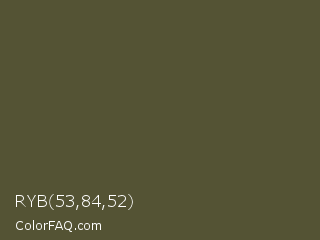 RYB 53,84,52 Color is a dark yellow color and the nearest color is Woodland #4d5328. Hex code #545334 and RGB value is rgb(84,83,52). In RGB color space, this color is composed of 33% red, 33% green, 20% blue, In CMYK color space, this color is composed of 0% cyan, 1% magenta, 38% yellow , 67% black , In HSL color space, this color has a hue angle of 58° , 24% saturation and 27% lightness.