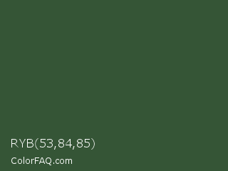 RYB 53,84,85 Color is a dark green color and the nearest color is Hunter Green #355e3b. Hex code #355536 and RGB value is rgb(53,85,54). In RGB color space, this color is composed of 21% red, 33% green, 21% blue, In CMYK color space, this color is composed of 38% cyan, 0% magenta, 36% yellow , 67% black , In HSL color space, this color has a hue angle of 122° , 23% saturation and 27% lightness.