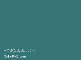 RYB 53,85,117 Color is a normal cyan color and the nearest color is Oracle #377475. Hex code #357575 and RGB value is rgb(53,117,117). In RGB color space, this color is composed of 21% red, 46% green, 46% blue, In CMYK color space, this color is composed of 55% cyan, 0% magenta, 0% yellow , 54% black , In HSL color space, this color has a hue angle of 180° , 38% saturation and 33% lightness.
