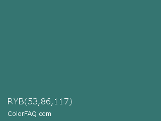 RYB 53,86,117 Color is a normal cyan color and the nearest color is Oracle #377475. Hex code #357571 and RGB value is rgb(53,117,113). In RGB color space, this color is composed of 21% red, 46% green, 44% blue, In CMYK color space, this color is composed of 55% cyan, 0% magenta, 3% yellow , 54% black , In HSL color space, this color has a hue angle of 176° , 38% saturation and 33% lightness.