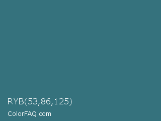 RYB 53,86,125 Color is a normal cyan color and the nearest color is Ming #36747d. Hex code #35727d and RGB value is rgb(53,114,125). In RGB color space, this color is composed of 21% red, 45% green, 49% blue, In CMYK color space, this color is composed of 58% cyan, 9% magenta, 0% yellow , 51% black , In HSL color space, this color has a hue angle of 189° , 40% saturation and 35% lightness.