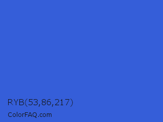 RYB 53,86,217 Color is a normal blue color and the nearest color is Royal Blue #4169e1. Hex code #355ed9 and RGB value is rgb(53,94,217). In RGB color space, this color is composed of 21% red, 37% green, 85% blue, In CMYK color space, this color is composed of 76% cyan, 57% magenta, 0% yellow , 15% black , In HSL color space, this color has a hue angle of 225° , 68% saturation and 53% lightness.