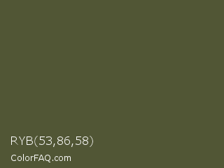 RYB 53,86,58 Color is a dark yellow color and the nearest color is Woodland #4d5328. Hex code #515635 and RGB value is rgb(81,86,53). In RGB color space, this color is composed of 32% red, 34% green, 21% blue, In CMYK color space, this color is composed of 6% cyan, 0% magenta, 38% yellow , 66% black , In HSL color space, this color has a hue angle of 69° , 24% saturation and 27% lightness.