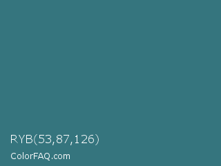 RYB 53,87,126 Color is a normal cyan color and the nearest color is Ming #36747d. Hex code #35757e and RGB value is rgb(53,117,126). In RGB color space, this color is composed of 21% red, 46% green, 49% blue, In CMYK color space, this color is composed of 58% cyan, 7% magenta, 0% yellow , 51% black , In HSL color space, this color has a hue angle of 187° , 41% saturation and 35% lightness.