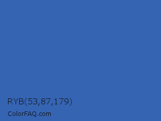 RYB 53,87,179 Color is a normal blue color and the nearest color is San Marino #456cac. Hex code #3564b3 and RGB value is rgb(53,100,179). In RGB color space, this color is composed of 21% red, 39% green, 70% blue, In CMYK color space, this color is composed of 70% cyan, 44% magenta, 0% yellow , 30% black , In HSL color space, this color has a hue angle of 218° , 54% saturation and 45% lightness.