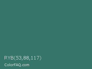 RYB 53,88,117 Color is a normal cyan color and the nearest color is Myrtle Green #317873. Hex code #35756a and RGB value is rgb(53,117,106). In RGB color space, this color is composed of 21% red, 46% green, 42% blue, In CMYK color space, this color is composed of 55% cyan, 0% magenta, 9% yellow , 54% black , In HSL color space, this color has a hue angle of 170° , 38% saturation and 33% lightness.