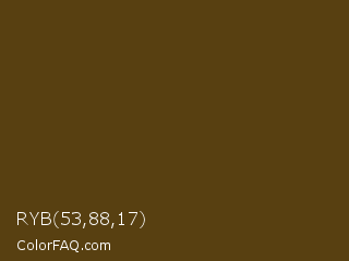 RYB 53,88,17 Color is a very dark orange color and the nearest color is Pineapple #563c0d. Hex code #584011 and RGB value is rgb(88,64,17). In RGB color space, this color is composed of 35% red, 25% green, 7% blue, In CMYK color space, this color is composed of 0% cyan, 27% magenta, 81% yellow , 65% black , In HSL color space, this color has a hue angle of 40° , 68% saturation and 21% lightness.