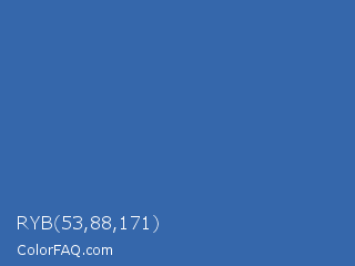 RYB 53,88,171 Color is a normal blue color and the nearest color is Azure #315ba1. Hex code #3567ab and RGB value is rgb(53,103,171). In RGB color space, this color is composed of 21% red, 40% green, 67% blue, In CMYK color space, this color is composed of 69% cyan, 40% magenta, 0% yellow , 33% black , In HSL color space, this color has a hue angle of 215° , 53% saturation and 44% lightness.