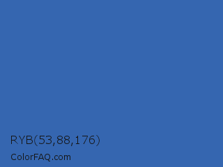RYB 53,88,176 Color is a normal blue color and the nearest color is San Marino #456cac. Hex code #3566b0 and RGB value is rgb(53,102,176). In RGB color space, this color is composed of 21% red, 40% green, 69% blue, In CMYK color space, this color is composed of 70% cyan, 42% magenta, 0% yellow , 31% black , In HSL color space, this color has a hue angle of 216° , 54% saturation and 45% lightness.