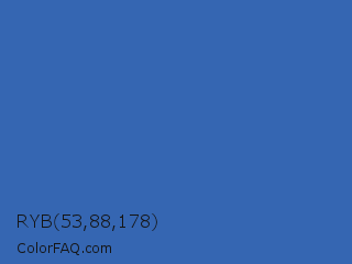 RYB 53,88,178 Color is a normal blue color and the nearest color is San Marino #456cac. Hex code #3566b2 and RGB value is rgb(53,102,178). In RGB color space, this color is composed of 21% red, 40% green, 70% blue, In CMYK color space, this color is composed of 70% cyan, 43% magenta, 0% yellow , 30% black , In HSL color space, this color has a hue angle of 216° , 54% saturation and 45% lightness.