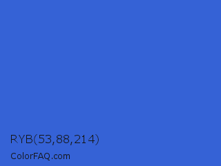 RYB 53,88,214 Color is a normal blue color and the nearest color is Royal Blue #4169e1. Hex code #3562d6 and RGB value is rgb(53,98,214). In RGB color space, this color is composed of 21% red, 38% green, 84% blue, In CMYK color space, this color is composed of 75% cyan, 54% magenta, 0% yellow , 16% black , In HSL color space, this color has a hue angle of 223° , 66% saturation and 52% lightness.