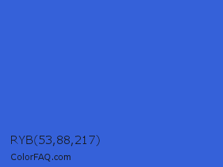 RYB 53,88,217 Color is a normal blue color and the nearest color is Royal Blue #4169e1. Hex code #3561d9 and RGB value is rgb(53,97,217). In RGB color space, this color is composed of 21% red, 38% green, 85% blue, In CMYK color space, this color is composed of 76% cyan, 55% magenta, 0% yellow , 15% black , In HSL color space, this color has a hue angle of 224° , 68% saturation and 53% lightness.