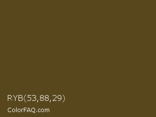RYB 53,88,29 Color is a dark orange color and the nearest color is Horses Neck #604913. Hex code #58471d and RGB value is rgb(88,71,29). In RGB color space, this color is composed of 35% red, 28% green, 11% blue, In CMYK color space, this color is composed of 0% cyan, 19% magenta, 67% yellow , 65% black , In HSL color space, this color has a hue angle of 43° , 50% saturation and 23% lightness.